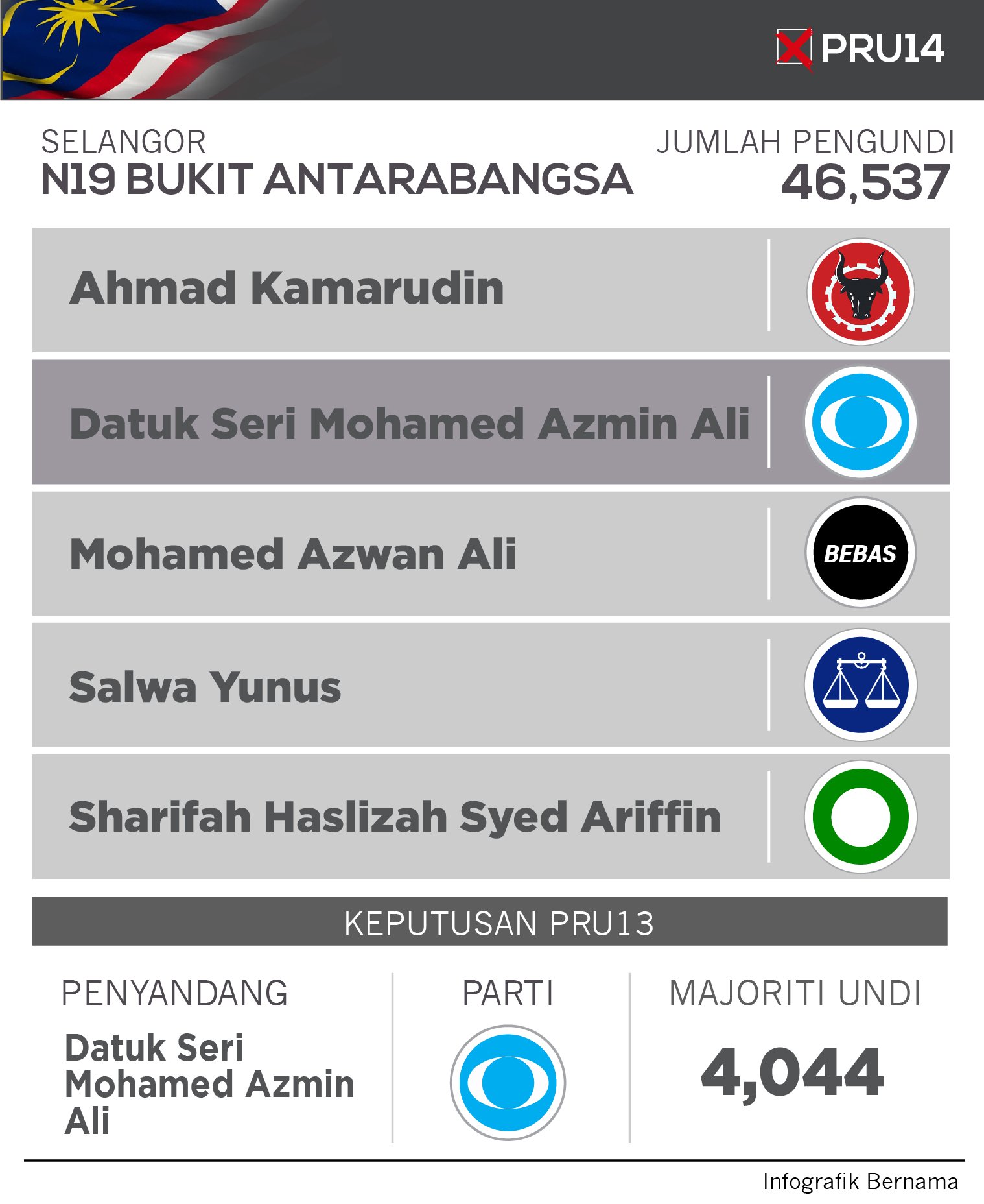 Hak Cipta Terpelihara 2018 Suruhanjaya Pilihan Raya Malaysia TEL. Selain Mohamed Azmin dan selebriti tanah air itu kerusi berkenaan turut ditandingi calon Barisan Nasional daripada UMNO Salwa Yunus calon PAS Syarifah Hazlizah. Azwan yang bertanding sebagai calon Bebas bakal menentang penyandang kerusi tersebut.